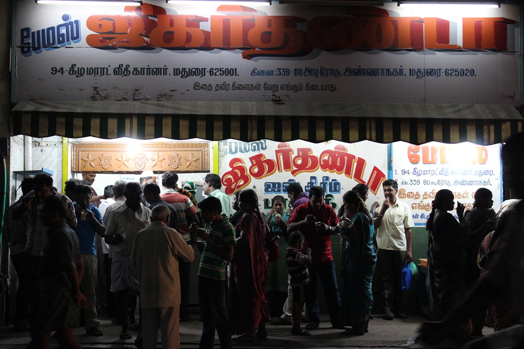 ミルクベースにナンナリシロップ、細かく刻んだファルーダ(寒天のようなもの)、そしてアイスをちょこんと乗せたマドゥライの地味に名物な飲み物、ジガールダンダ。カラメルのようなコクのある甘味と食感が癖になります。
