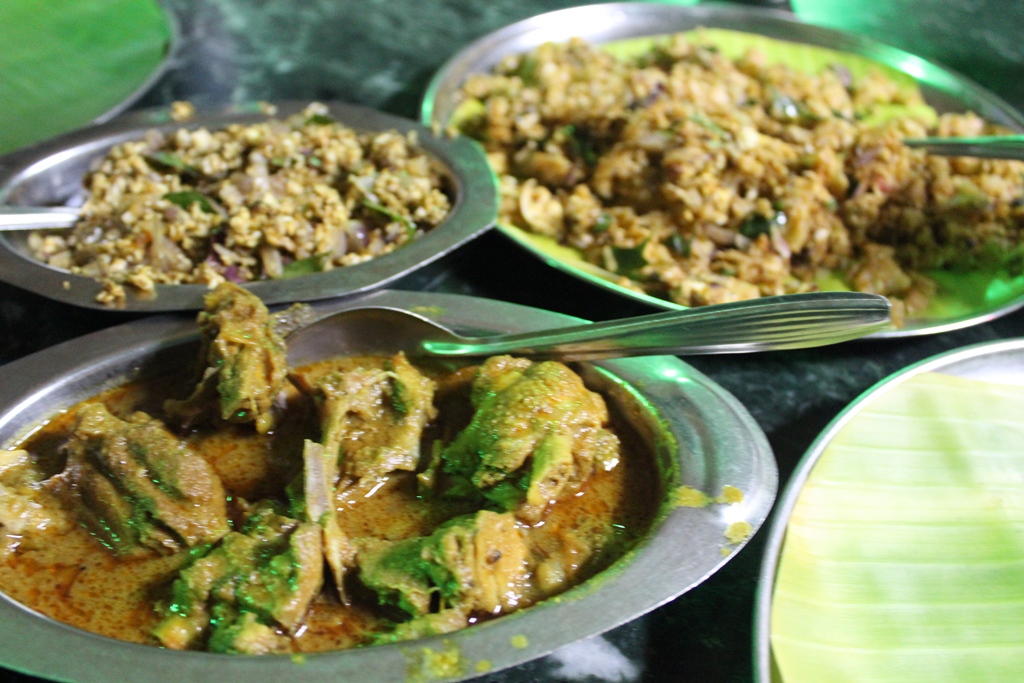 カントリーチキンとエッグフライ、そして名物エッグパロータ(Kothu Parotta)。