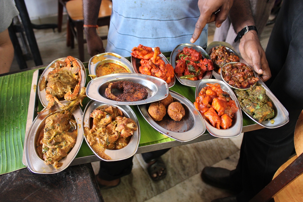 チキンやマトンやフィッシュのグレイビーアイテムやフライアイテム、そしてエビやカニ(Nandu masala)も。選んでとれるのはうれしいけど、だいたい冷めてるよなぁ、。