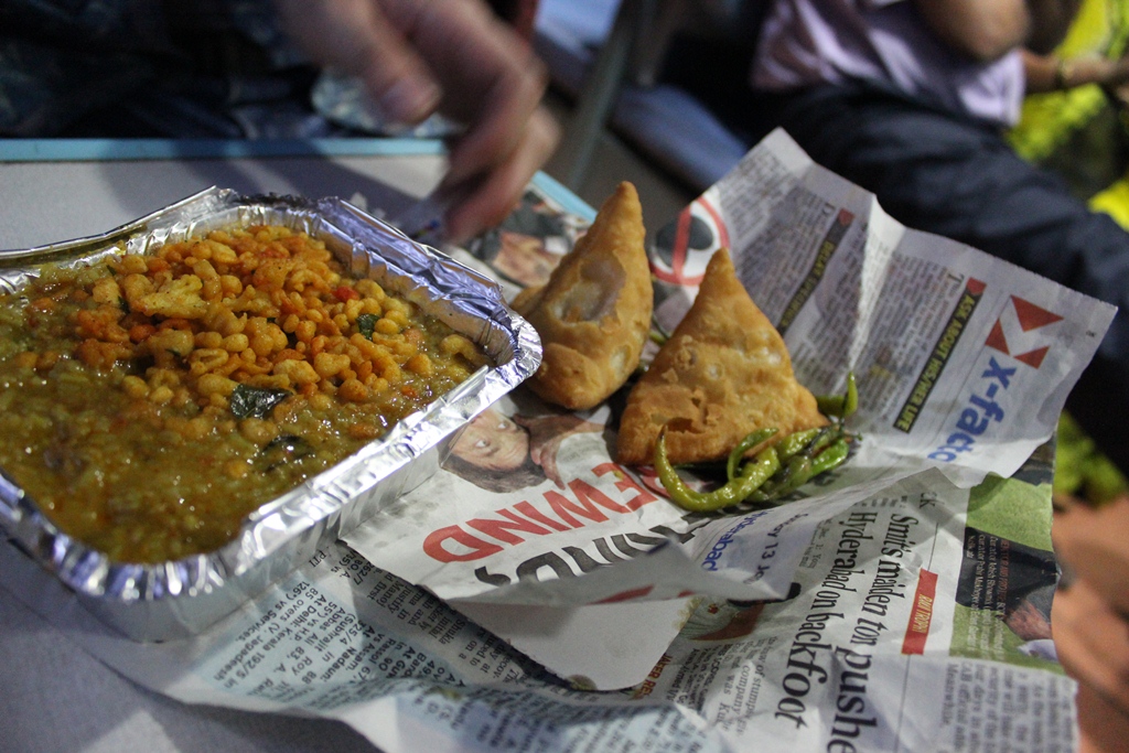 インド版、スパイス入りリゾットのような混ぜご飯、ベジ・バラ・バトをチープなプラスティックのスプーンで食べた。