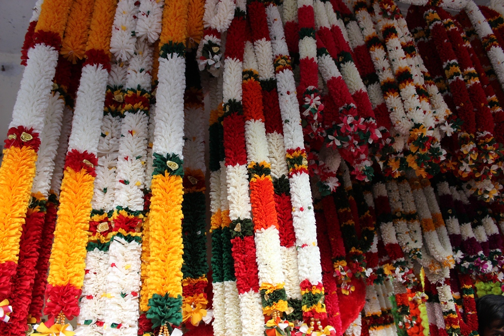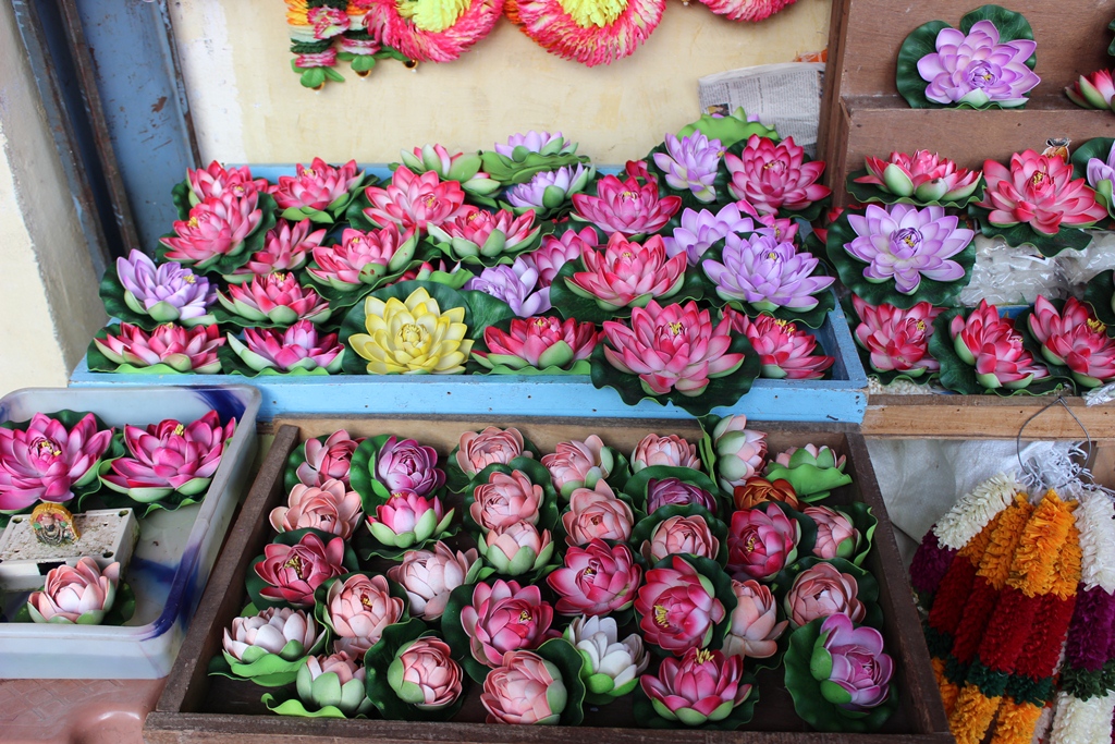 手作りのマリーゴールドや造花も含め、寺院周辺にはお花をたくさん売っている。